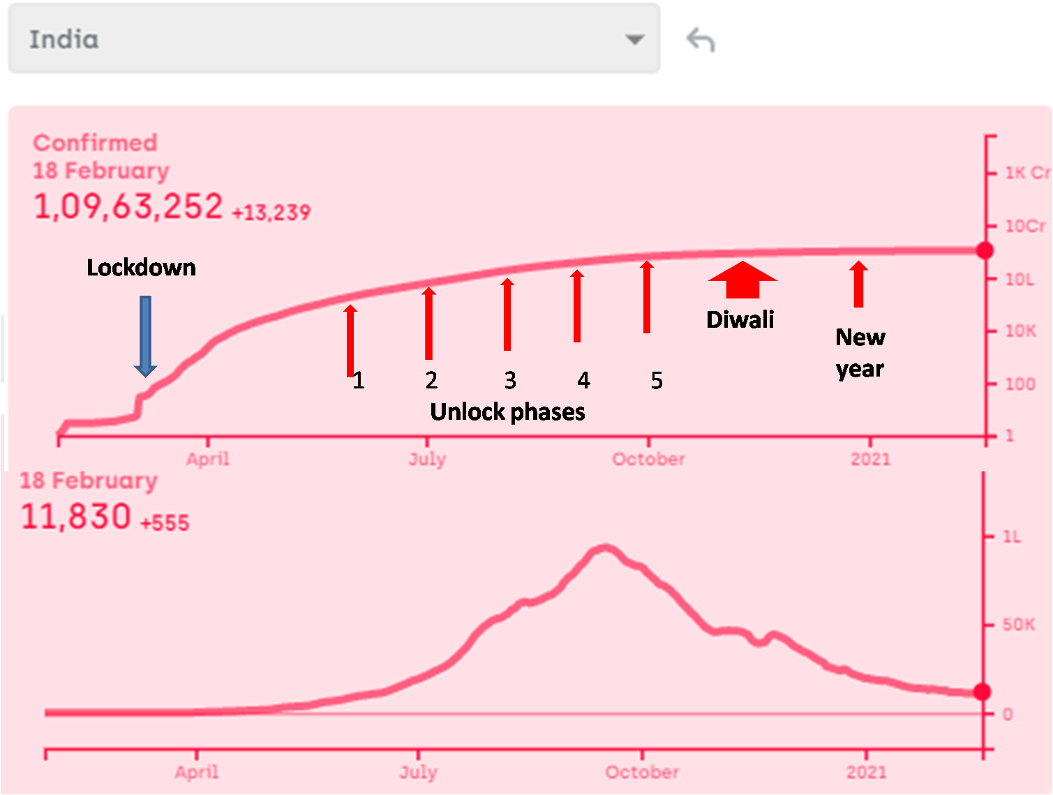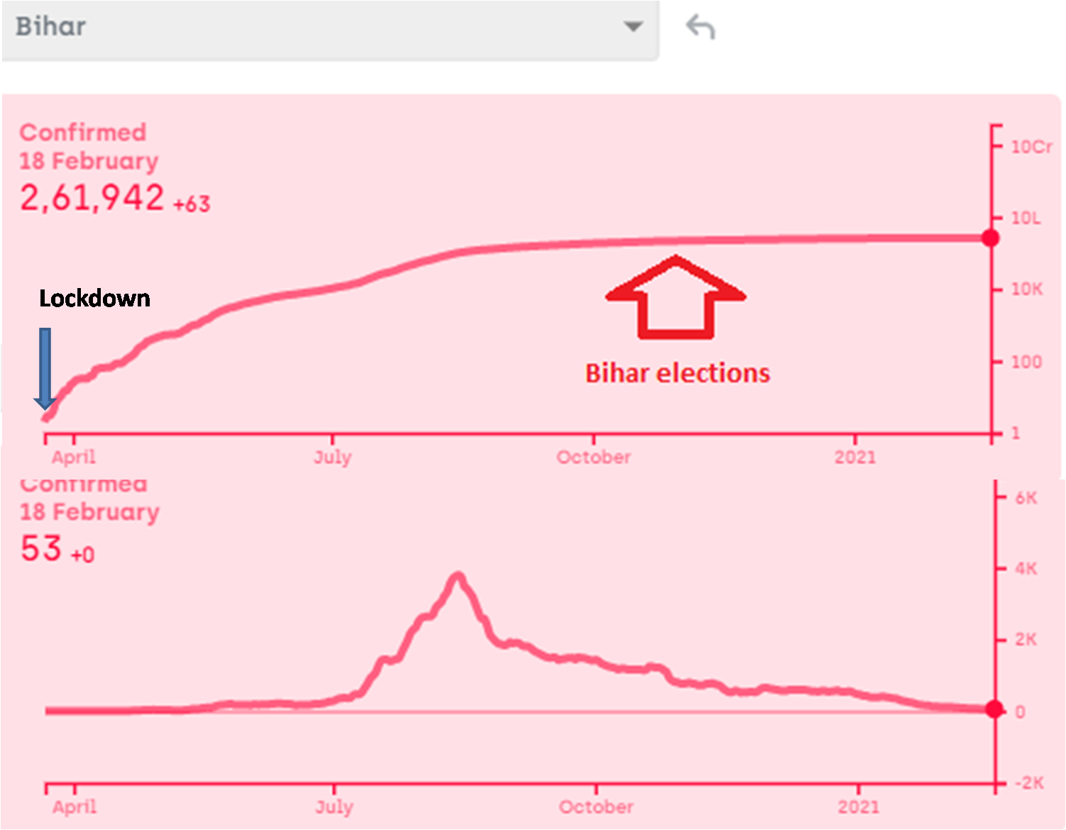 An epidemic follows a typical shape of the curve when plotted daily or cumulatively. If lockdowns really worked we should see at least a temporary downward shift in the slope, especially on a log scale. Conversely whenever restrictions were lifted or there was large scale crowding, there should be a local upward movement of the curve. Here are the time trends plotted along with the dates on which restrictions were imposed or lifted, election campaigns, rallies, big meetings or celebrations were conducted. The upper curves are cumulative incidence on log scale, lower curves daily new cases (7 day running average) on linear scale. All data taken from https://www.covid19india.org/
