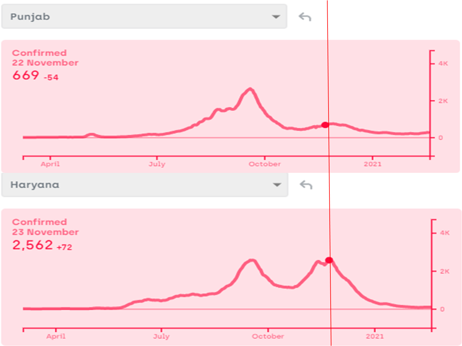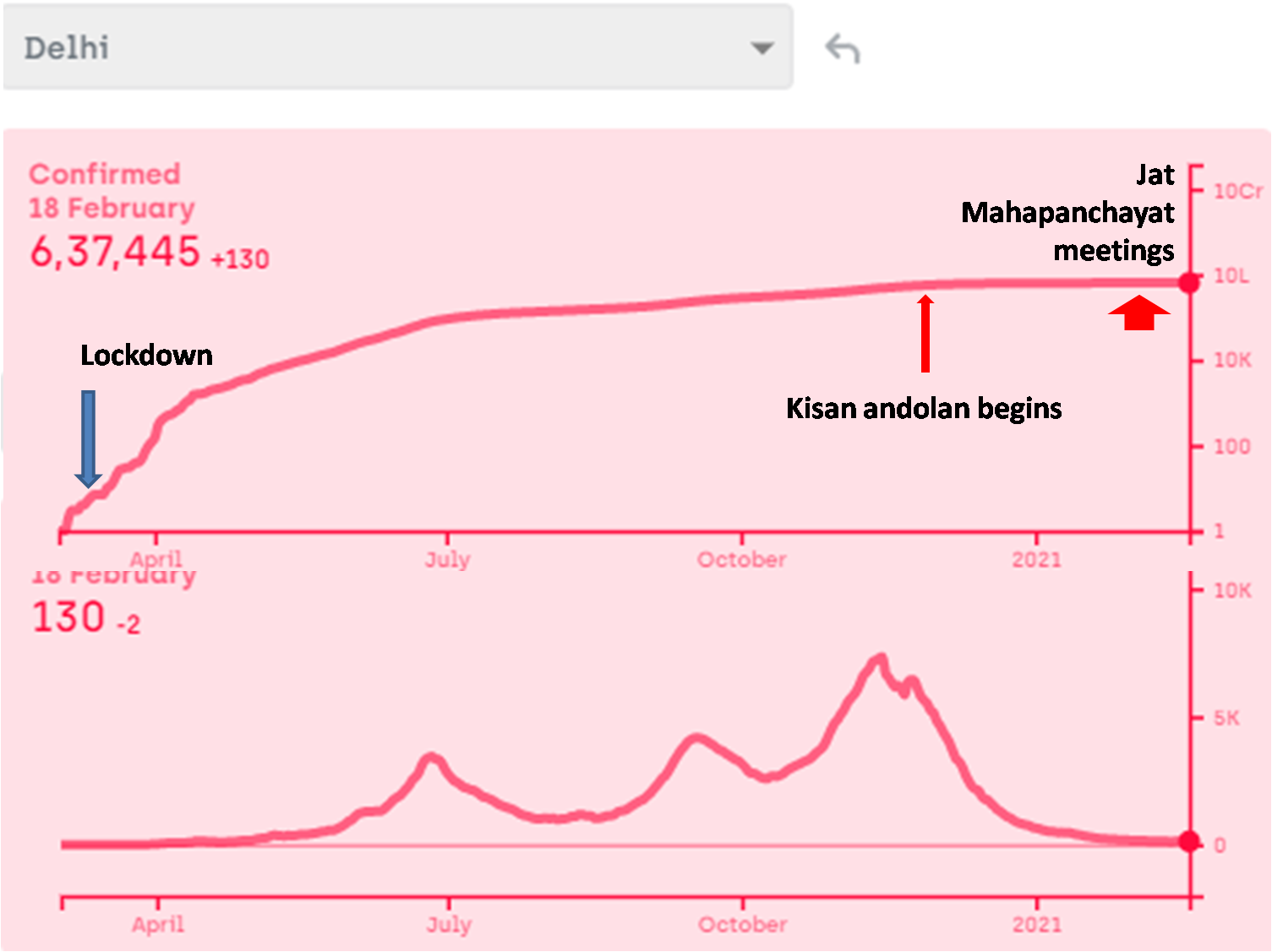 The Kisan Andolan should have theoretically been the ideal occasion for spreading the infection. But there appears to be no increase in the incidence in Delhi, nor in Punjab and Haryana (below).